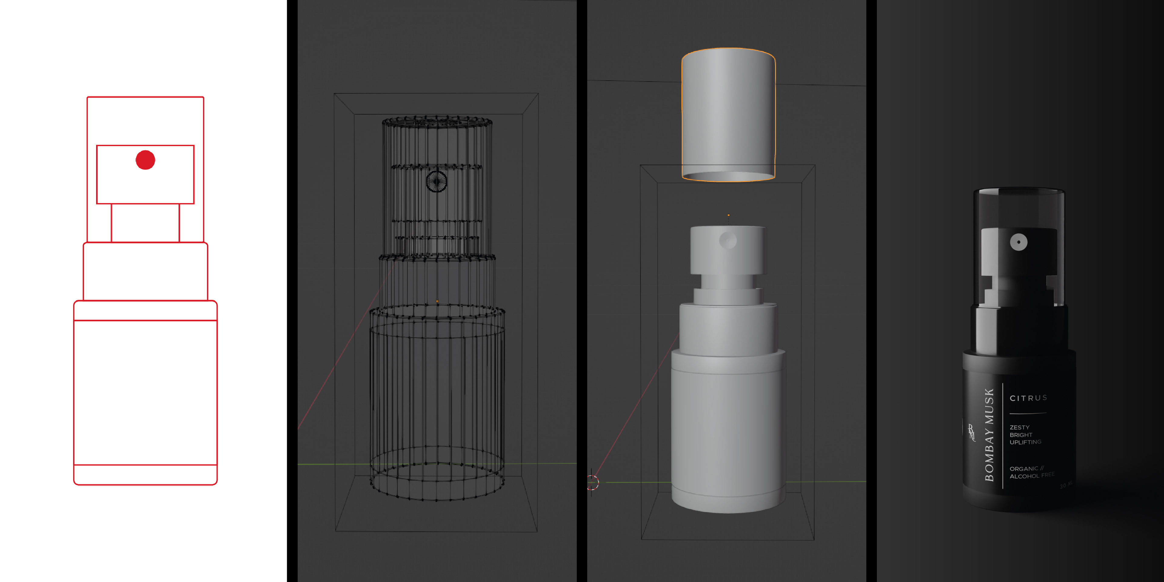Accurate product images and measurements were used to build the bottle: a flat guide was prepared in Illustrator, then the 3D mesh and materials were developed in Blender for photorealistic results.
