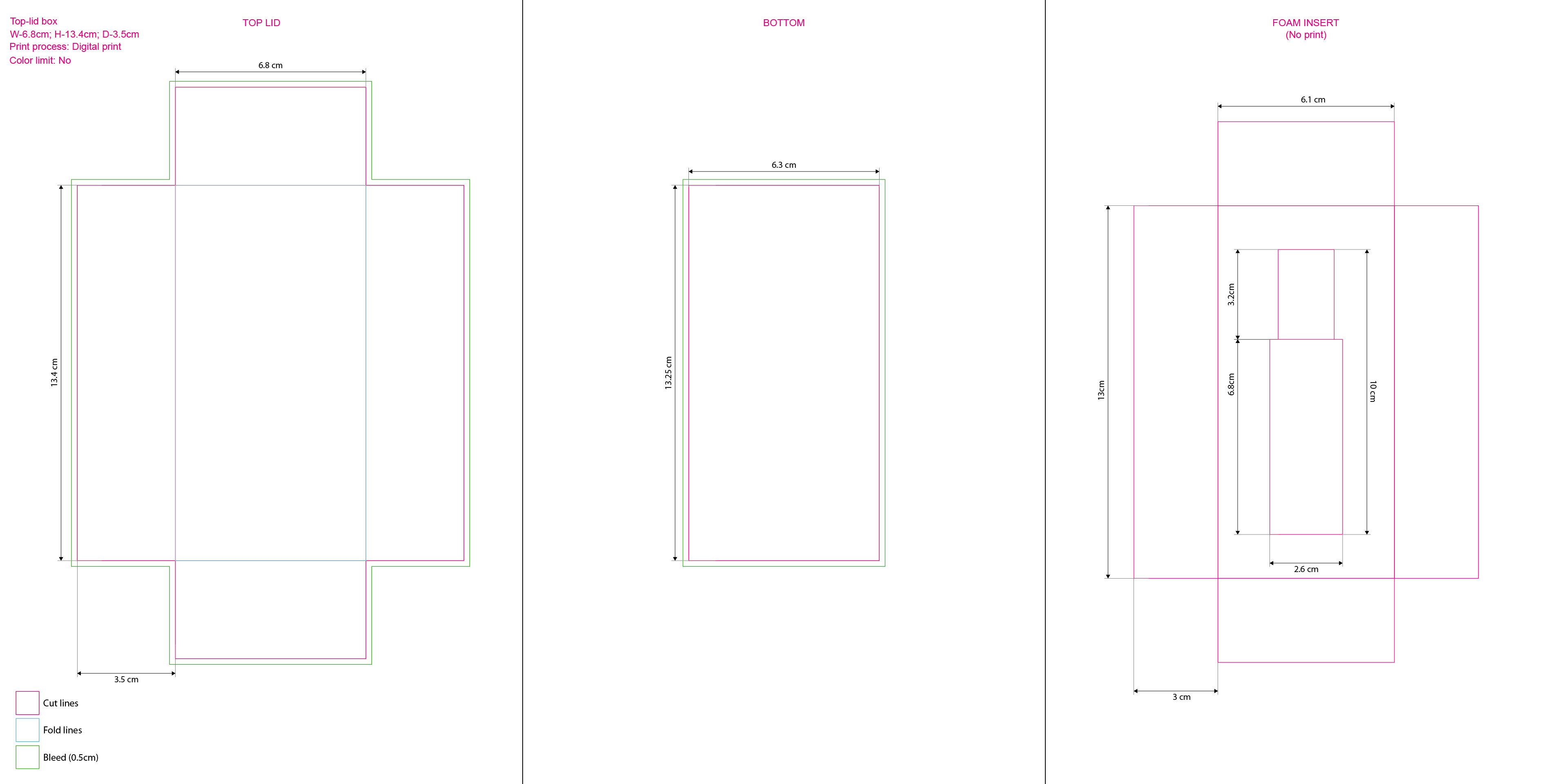 All my packaging design projects begin with creating dielines and determining the printing method to be used for manufacturing the packaging. For this particular project, the design featured a rectangular top-lid box with a foam cutout inside to securely hold the spray bottle in place.